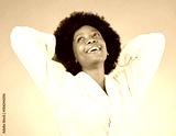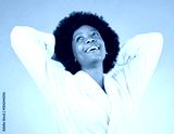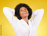 Black woman relax, bathrobe and happiness in a studio ready for luxury spa treatment for self care. Isolated, yellow background and happy young female with a smile from skincare and wellness