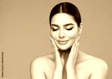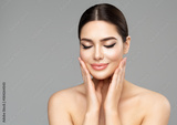 Beauty Face Skin Care. Woman with Full Lips Natural Makeup over isolated background. Beautiful Model enjoying Spa Massage. Facial Plastic Surgery and Dermal Filler Cosmetology