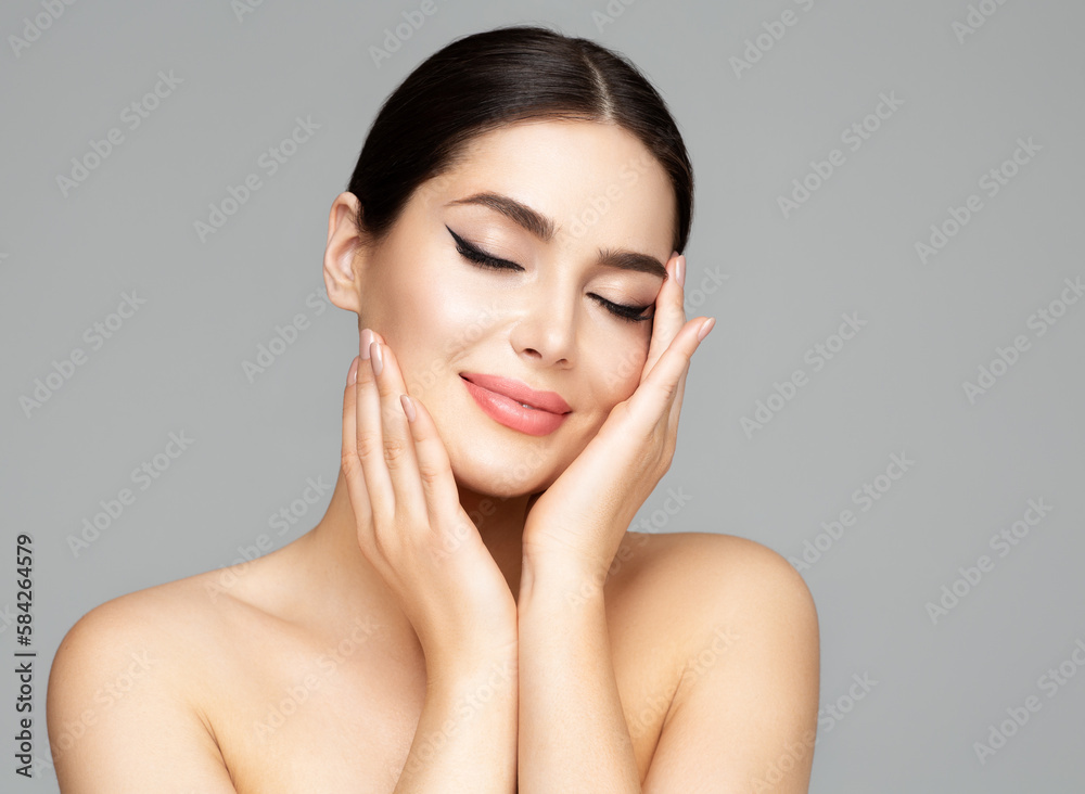 Woman Face Skin Care. Beauty Model holding Face in Hands. Beautiful Girl with Smooth Skin and Plump Lips Makeup over Gray. Facial Spa Cosmetology and Plastic Surgery