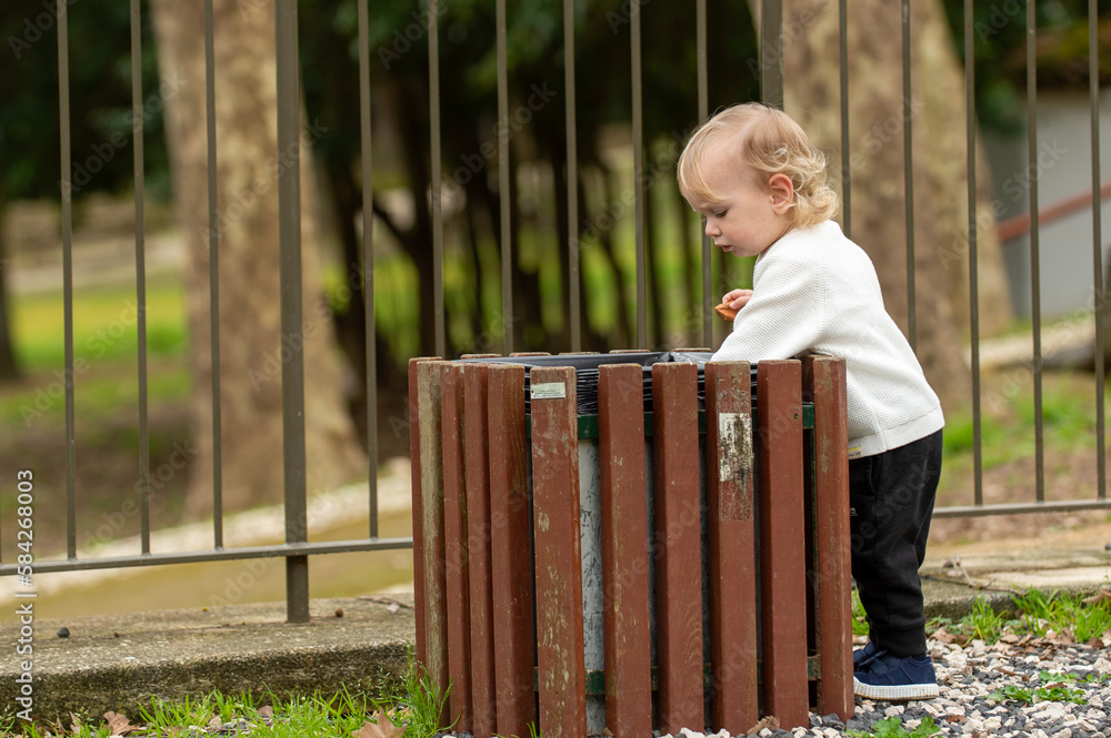 Adorable caucasian child looking into a trashcan with curiosity on a spring day. Cute blonde kid exploring the world around him in a park. Beautiful boy searching through a trash can in a garden.