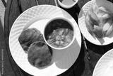 Indian fasting breakfast or lunch thali. Aloo ki sabzi or potato curry along with Sabudana Vada and Kuttu ki puri. Fried buckwheat bread. Served with fresh fruits. Copy space. Navratri, Mahashivratri