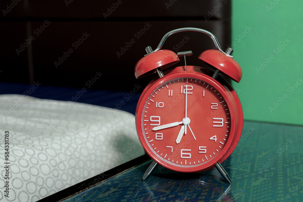 Close-up of red retro alarm clock on table near the bed in the room.