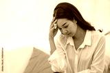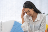 businesswoman prop up, support the chin, hence to rest the chin on hand and scratching head and hair from headache overworked depression. depressed girl prop up chin and scratching head.