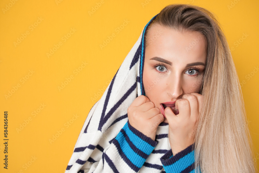Panicked young woman biting fingernail, being terrible accident, isolated on yellow background. Frightened girl