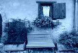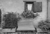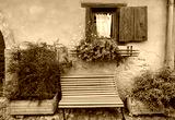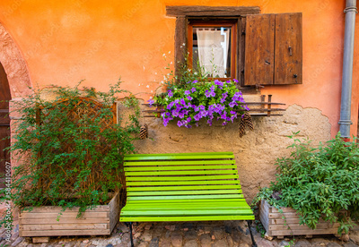 Old window and flowers on the Vintage house and a bench, Eguisheim, France