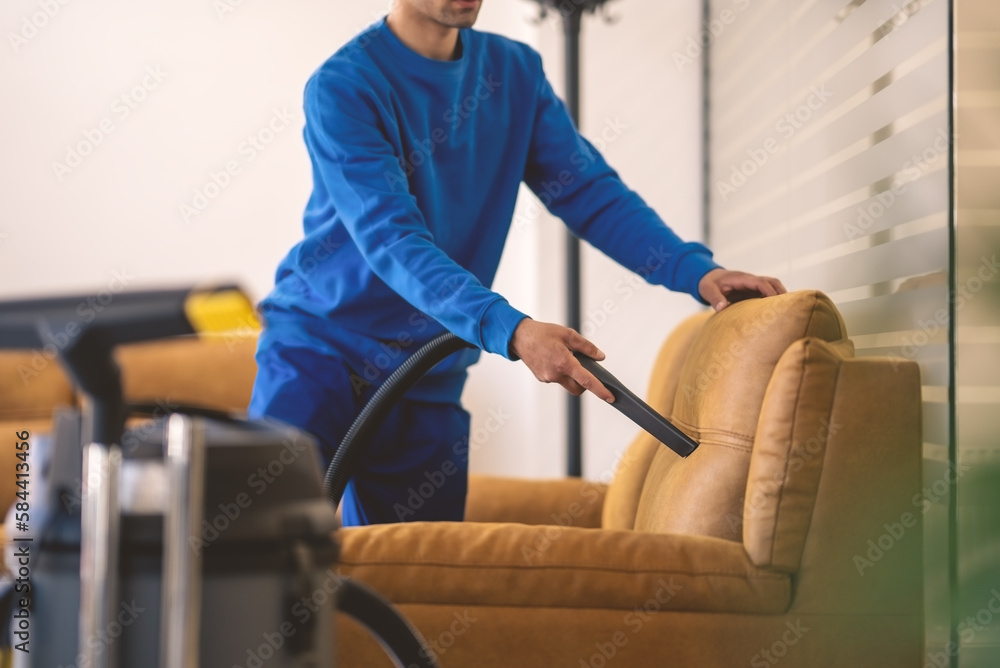 Upholstery vacuming and cleaning.Cleaning furniture.Worker cleaning upholstery.