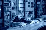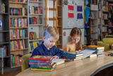 Schoolchildren reading books together while sitting at table in library. Back to school