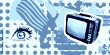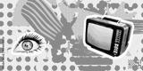 Contemporary digital collage art. Modern trippy design. Retro tv news and eye.