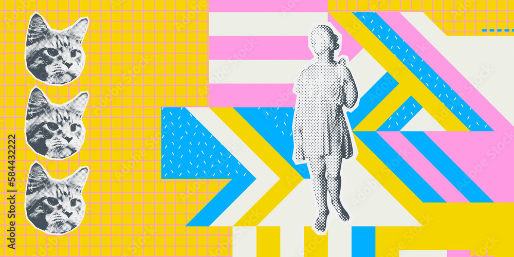 Contemporary digital collage art. Modern trippy design. Antique sculpture and kitty head