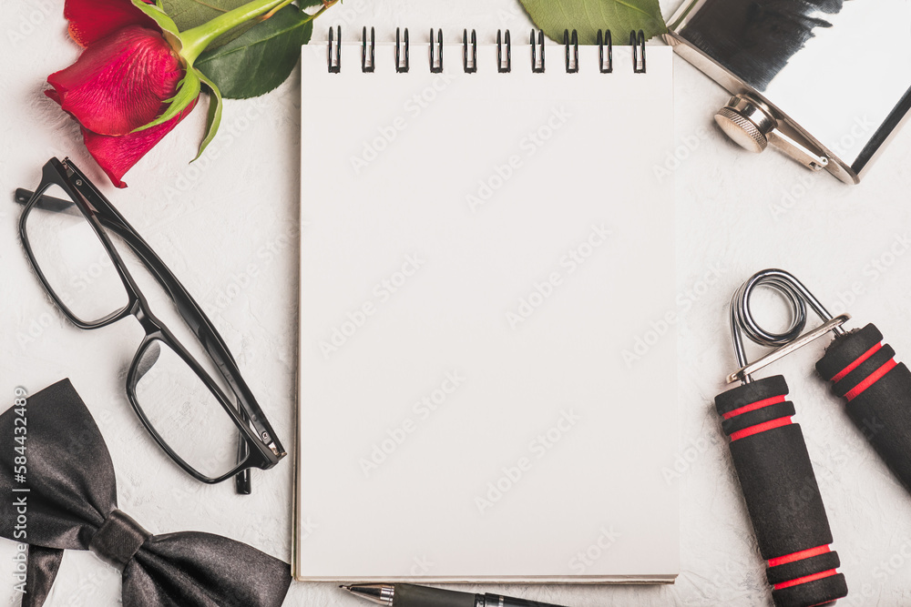 Postcard for Father's Day. A bow tie, glasses, a red rose and a hand expander and a white notepad on a white background.