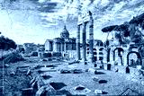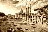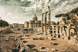 Ancient ruins of a Roman Forum or Foro Romano, Rome, Italy. Artistic retro style.