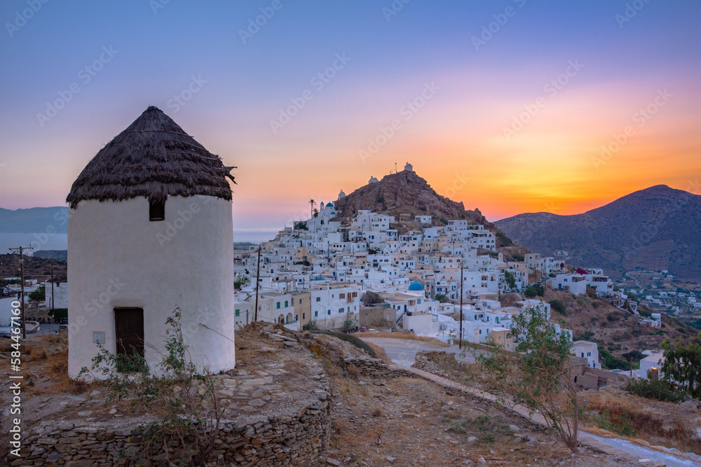 Traditional houses, wind mills and churches in Ios island, Cyclades, Greece.