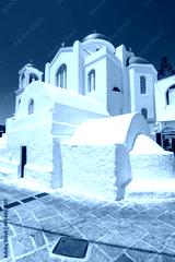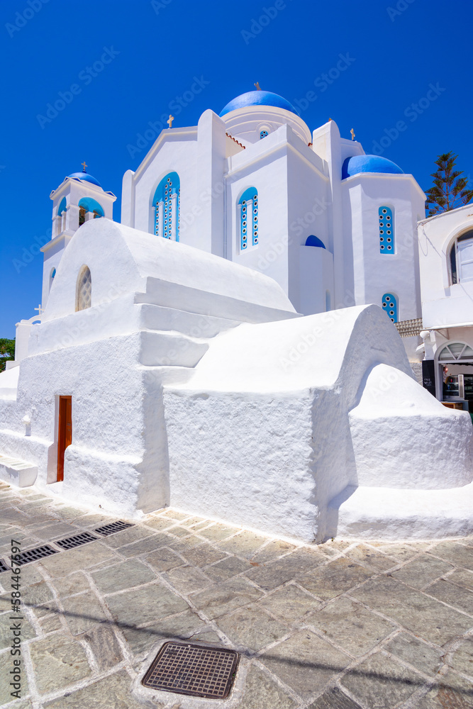 Traditional houses, wind mills and churches in Ios island, Cyclades, Greece.