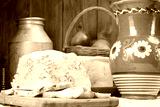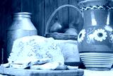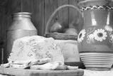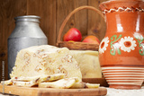 homemade cheese with nuts and pitcher of milk on wooden table.
