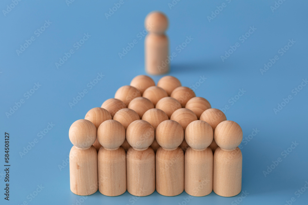 Business and entrepreneurship concept. Audience at the conference together. Wooden figures on grey background.