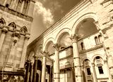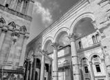 The landmark ancient Roman columns and arches of the central courtyard, called the Peristyle, in Diocletian's Palace, located in the Old Town of Split, Croatia