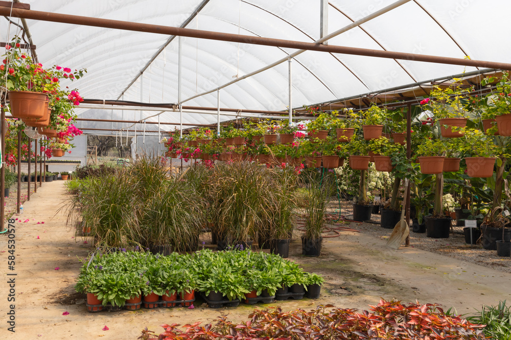 Nursery. Beautiful garden shop ready for business. A row of plants offered for sale.