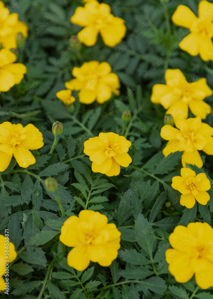Yellow blossom: Tagetes patula (marigold). Shop garden. Nursery.