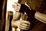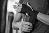 Man wrapping hand, boxing and fitness with martial arts in gym, exercise and power with strong person. Workout, male boxer training in combat and sport, athlete ready to fight and closeup of hands