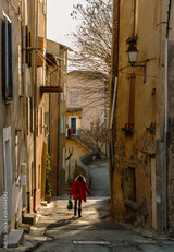 Woman walking in a narrow street of the old town of Digne les Bains, Alpes de Hautes Provence, France.