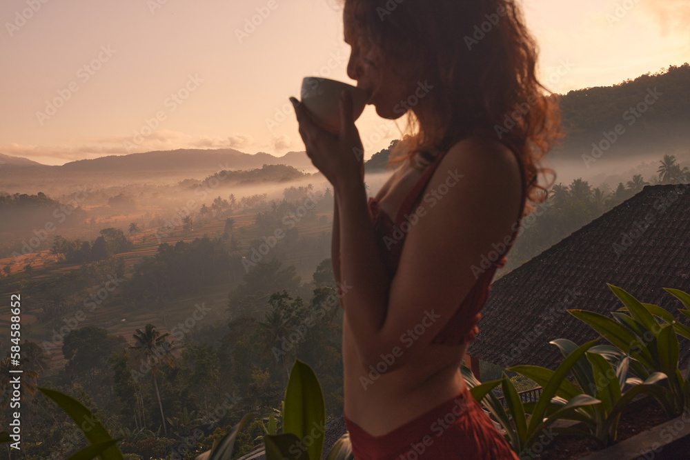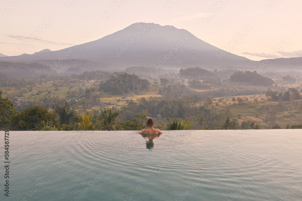 Woman enjoys a relaxing yoga retreat at a beautiful Bali resort with stunning views of the sunrise and Agung volcano. Travel and wellness concept.