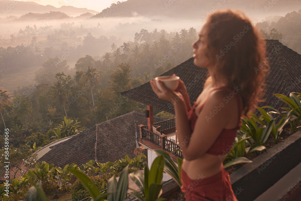 Woman enjoys a relaxing yoga retreat at a beautiful Bali resort with stunning views of the sunrise and Agung volcano. Travel and wellness concept.