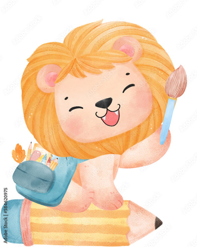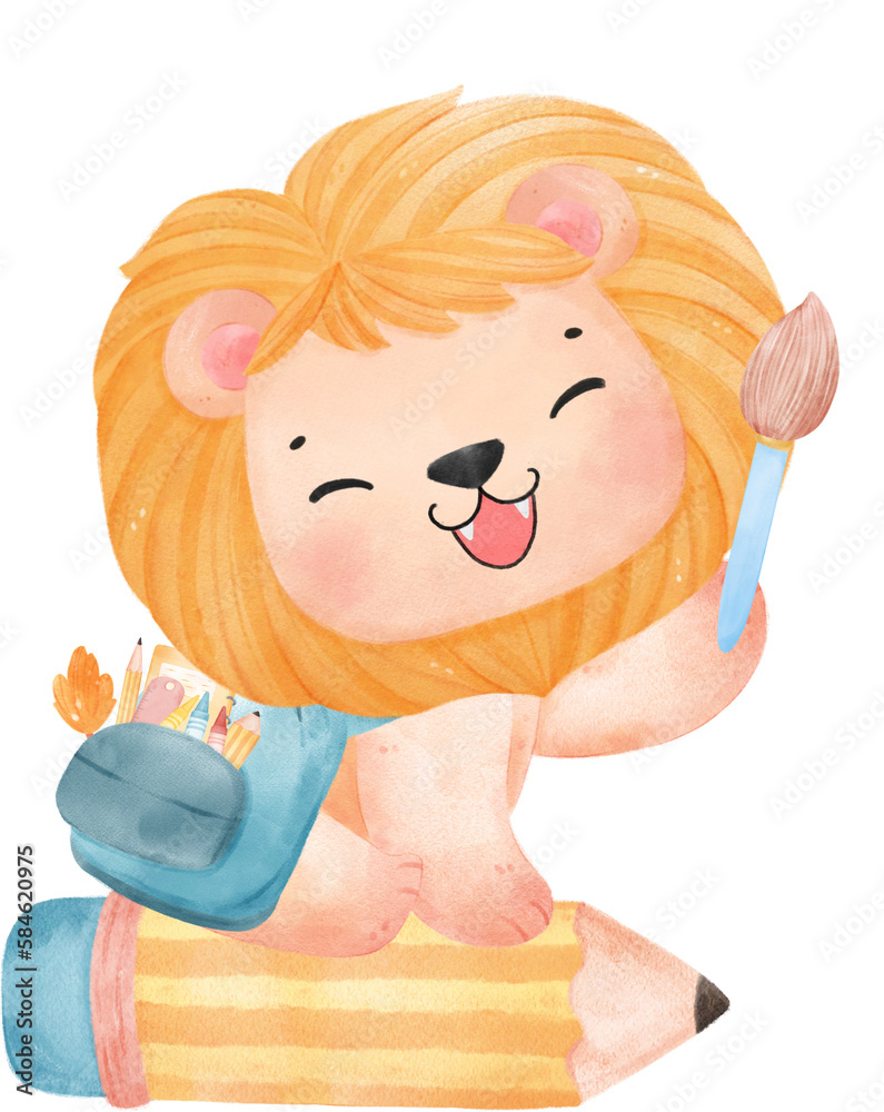 cute watercolour baby lion animal kid reading book, back to school cartoon character illustration