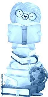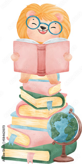 cute watercolour baby lion animal kid reading book, back to school cartoon character illustration