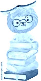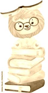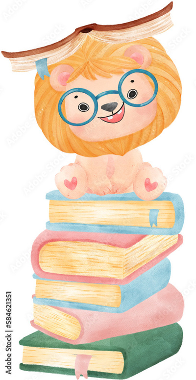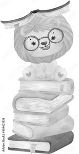 cute watercolour baby lion animal kid reading book, back to school cartoon character illustration