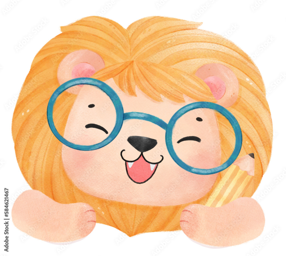 cute watercolour baby lion animal kid reading book, back to school cartoon character illustration