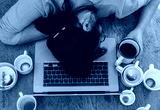 Exhausted female worker surrounded by coffee cups sleeping at workplace over laptop. Tired over work woman having too much work and coffee, napping on laptop. Caffeine addicted bad lifestyle concept.