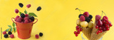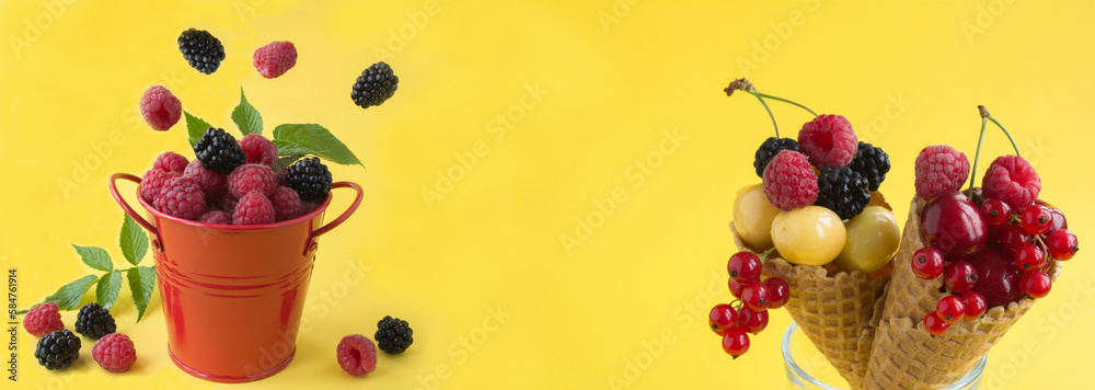Fruit and berry in the red bucket and ice cream cone on the yellow background. Close-up. Copy space.