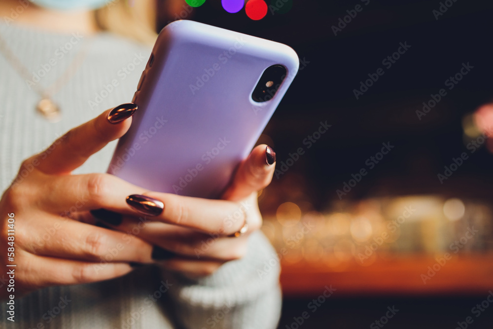 Female hand holding purple phone in clear silicone case isolated. Clear phone case mock up back view.