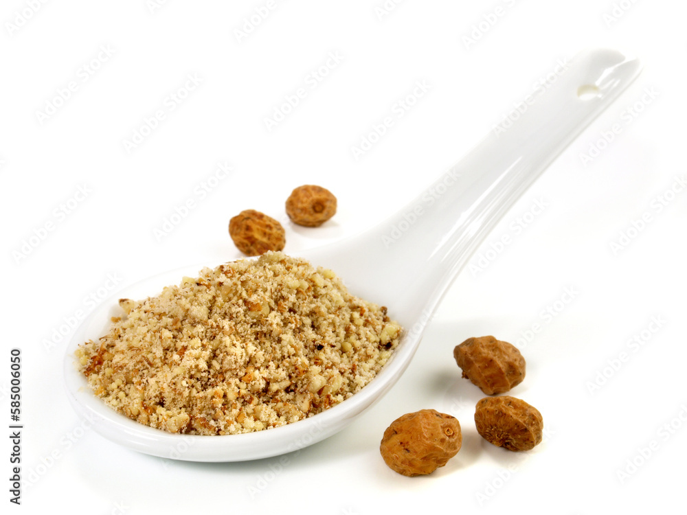 Ground Earth Almonds - Organic Tigernuts on white Background