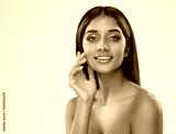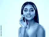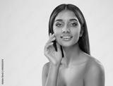 Young Woman perfect Healthy Teeth Smile over White. Beautiful Indian Girl with Natural Makeup. Women Skin and Dental Care. Happy Beauty Model Smiling Face
