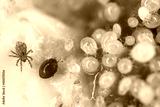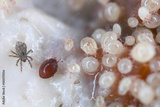 Magnification of tiny Oribatid mites (Oribatida or beetle mites) of the superorder Acariformes and Acaridae family mites on perishable food.