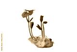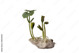 Sprouted seeds of Momordica with primary roots, stem, cotyledons, and first leaves on a cotton swab against a white background. Macro photography. Copy space. PNG