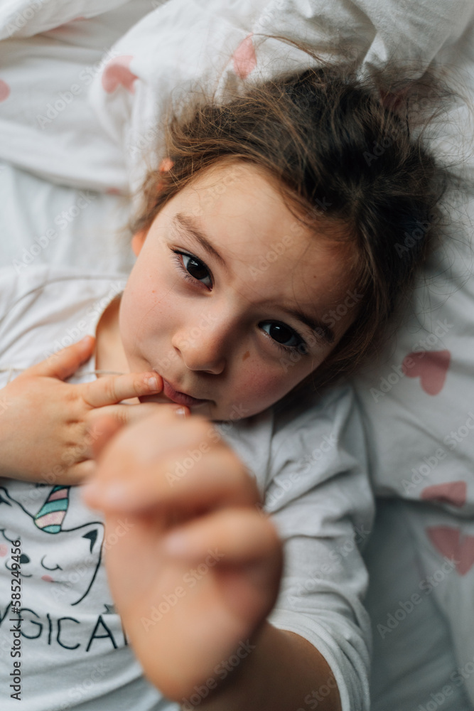 Top view vertical lifestyle photo of 5 years old girl in bed, happy face