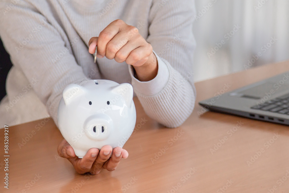 woman hand putting money coin into piggy for saving money wealth and financial concept.