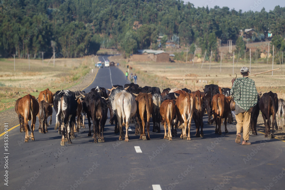 Herd of cows on the Ethiopian village road