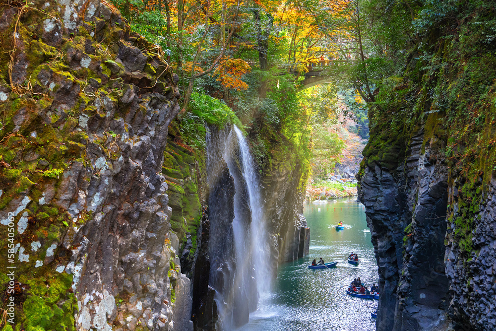 Miyazaki, Japan - Nov 24 2022: Takachiho Gorge is a narrow chasm cut through the rock by the Gokase River, plenty activities for tourists such as rowing and trekking through beautiful nature