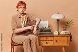 Serious strict redhead European woman indicates at watch asks not to be late dressed in elegant outfit wears big spectacles poses on chair uses retro typewriter isolated over brown background