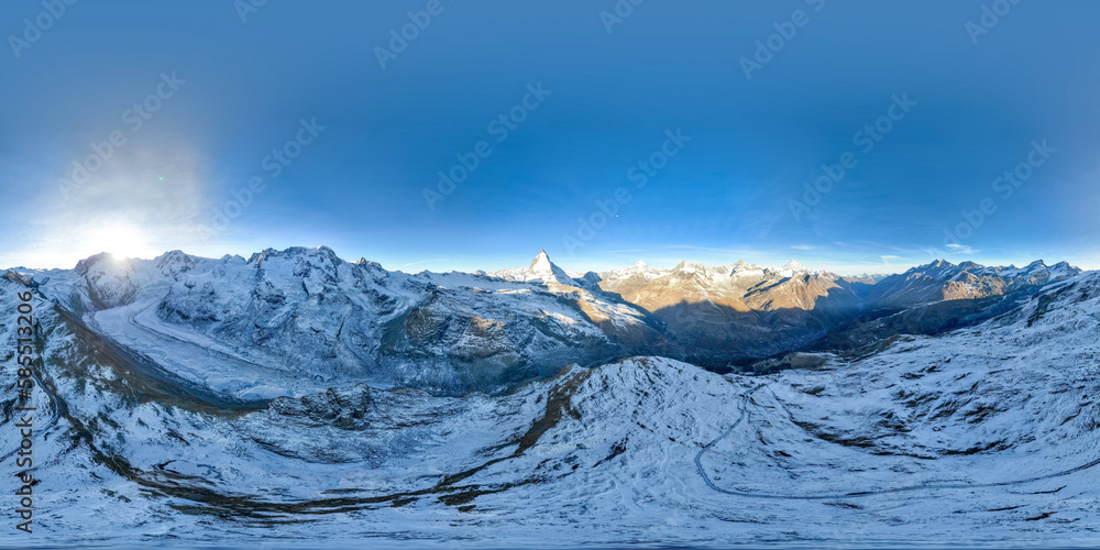 Seamless spherical HDRI aerial panorama 360 degrees for VR virtual reality of iconic Matterhorn mountain in autumn. Zermatt popular travel ski resort in the alps, Switzerland. Nature landscape.