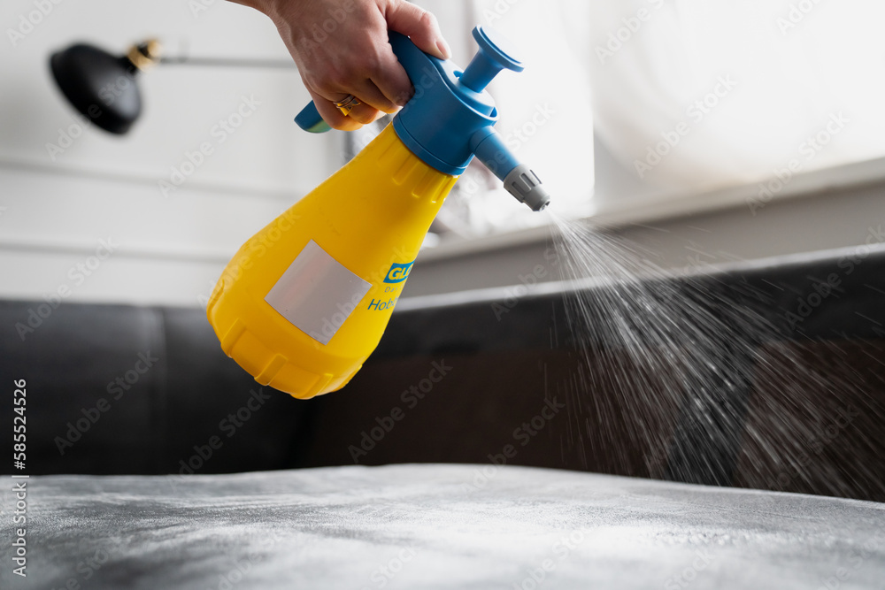 Spraying chemicals on mattress before cleaning it with wet vacuum