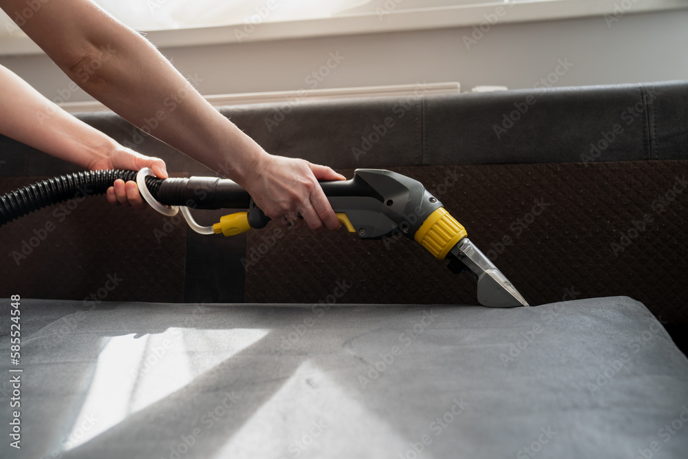 Sideview of two hands holding wet and dry vacuum cleaner using on sofa mattress