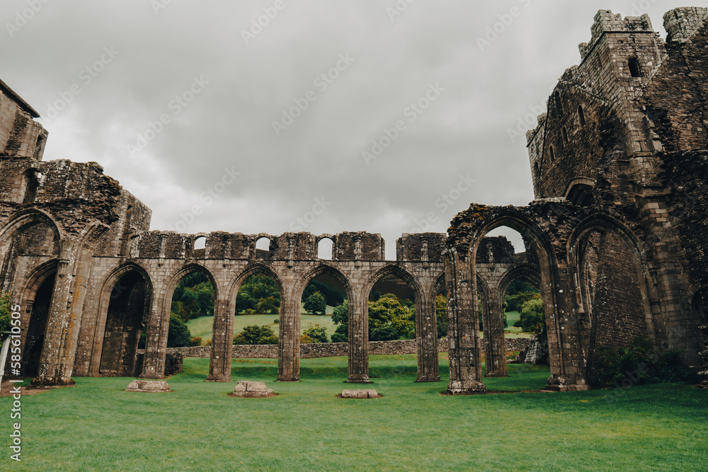 Landmarks of Wales travel concept. View of ancient ruins of the castle/church in Brecon Beacons National Park, United Kingdom. Llanthony Priory Abbey in the Vale of Ewyas. Llanthony priory ruins.