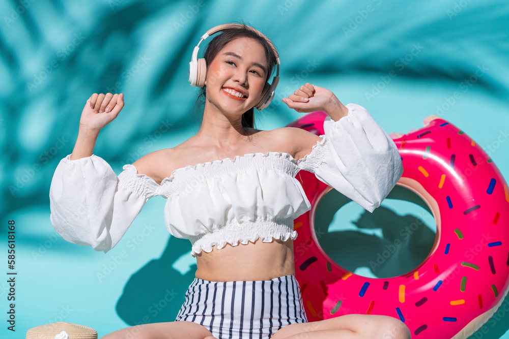 delight cheerful asian teen woman relax casual in summer dress listening music from headphone while dancing along with melody,woman sit happiness with inflatable summer concept studio shot