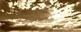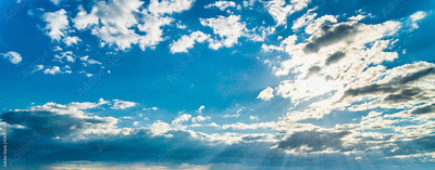 Sunbeams breaking through dramatic cumulus clouds. Change of weather. Hope or religion concept.