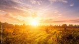 Sunrise on a field covered with wild flowers in summer season with fog and trees with a cloudy sky.