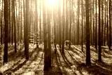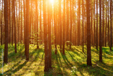 Sunset or dawn in a pine forest in spring or early summer.